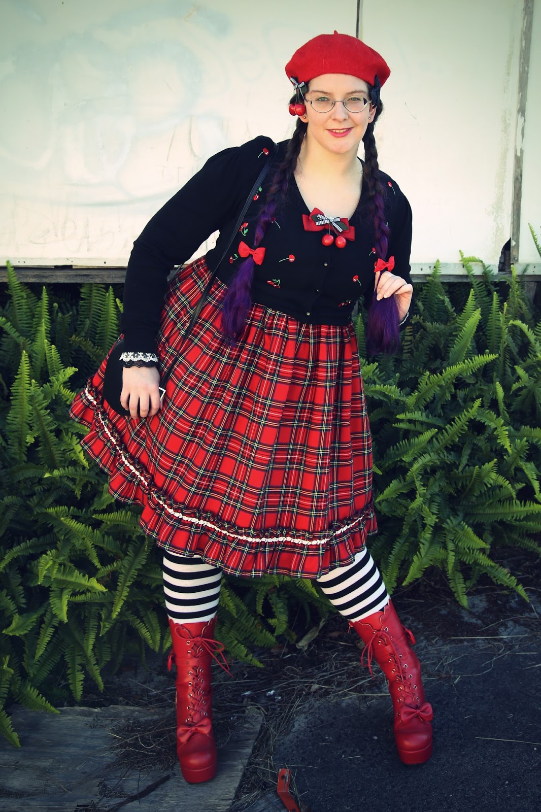 I need to grow my hair out again, I kind of miss having long hair (but at the same time shorter is so much easier to curl when I do want it curled :P). You can't really see that purple very well against the dark colours of your outfit, is it like a plum kind of shade or something more "Halloween-y"?